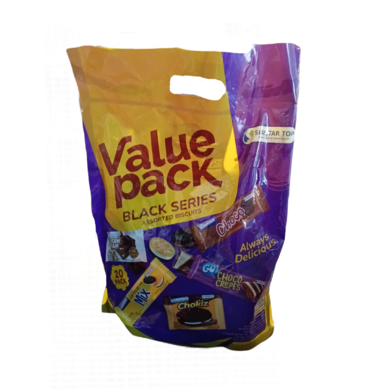 snack / makanan ringan dalam kemasan value pack dengan nama Black Series dan berat total 288 gram