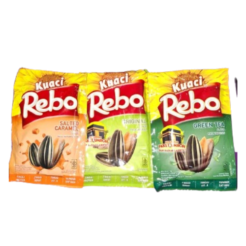 Kuaci Rebo Green Tea adalah cemilan kuaci dengan rasa teh hijau yang dibuat dari biji bunga matahari dan dipadukan dengan rempah-rempah, serta diolah secara higienis. Kemasan praktisnya cocok untuk camilan di mana saja.