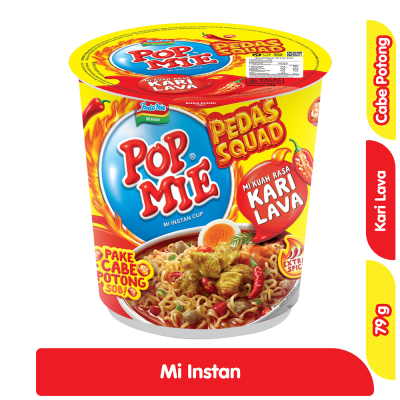 Pop Mie Kuah Kari Lava adalah mi instan cup dengan kuah kari yang pedas, gurih, dan kaya rempah. Varian “Lava” menghadirkan sensasi pedas yang lebih mantap dibanding kari biasa, cocok untuk pecinta makanan pedas. Dengan porsi 79 gram, Pop Mie ini praktis dan mudah disajikan kapan saja.