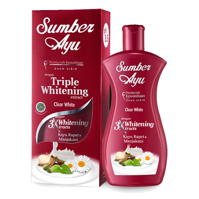 MANFAAT : SUMBER AYU PEMBERSIH KEWANITAAN CLEAR WHITE TRIPLE WHITENING EXTRACTS TELAH TERUJI SECARA KLINIS DENGAN FORMULA PH 3.5 DAN KANDUNGAN BAHAN ALAMINYA MEMBANTU MEMBERSIHKAN, MENCERAHKAN KULIT AREA KEWANITAAN YANG MENGGELAP DI TAHAP AWAL DAN MEMBUAT AREA TERSEBUT TERASA LEBIH KENCANG.