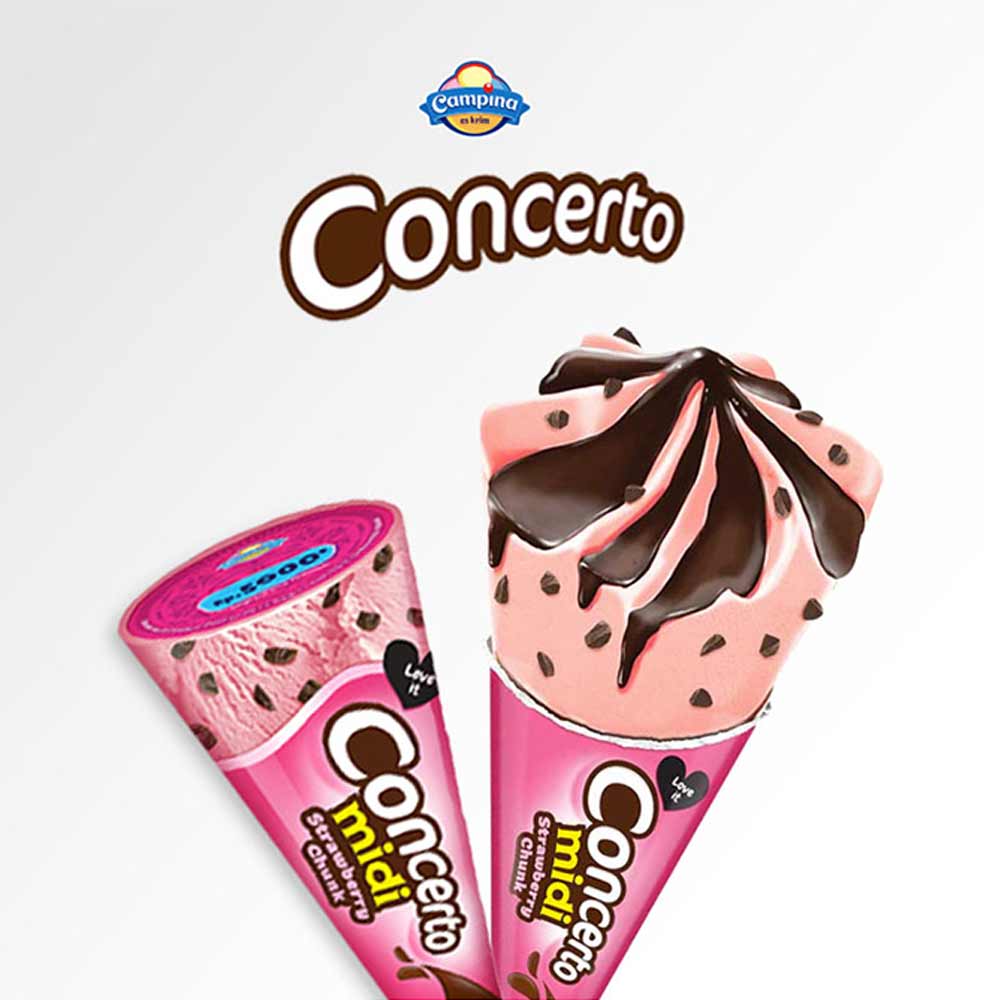 Campina Ice Cream Concerto Midi Strawberry Chunk 80mL merupakan es krim unik dengan rasa strawberry yang lezat